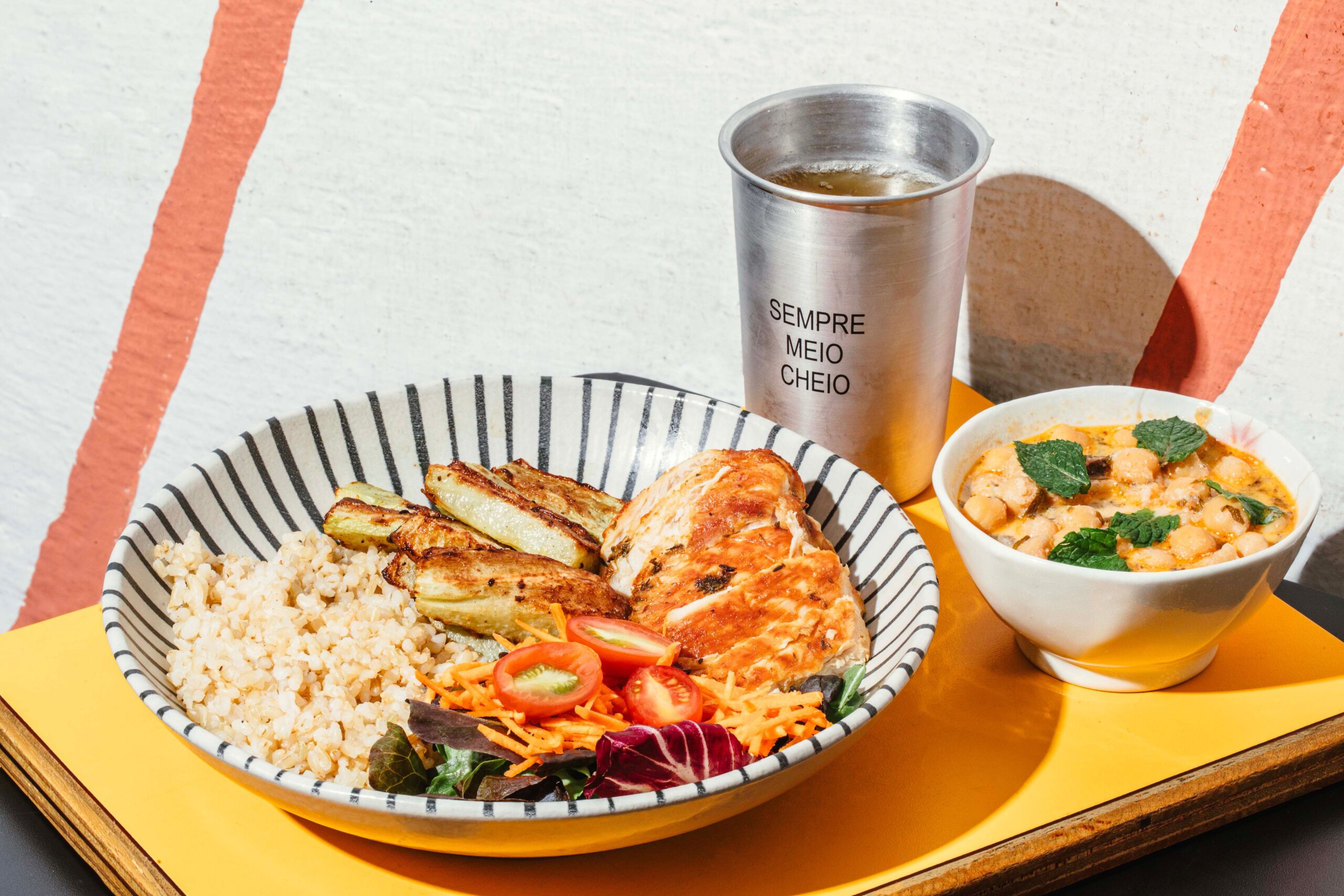 / arroz integral, grão de bico com tahine, filet de frango Korin grelhado, chuchu assado com alho e cominho acompanha uma mini saladinha de folhas e tomatinho cereja