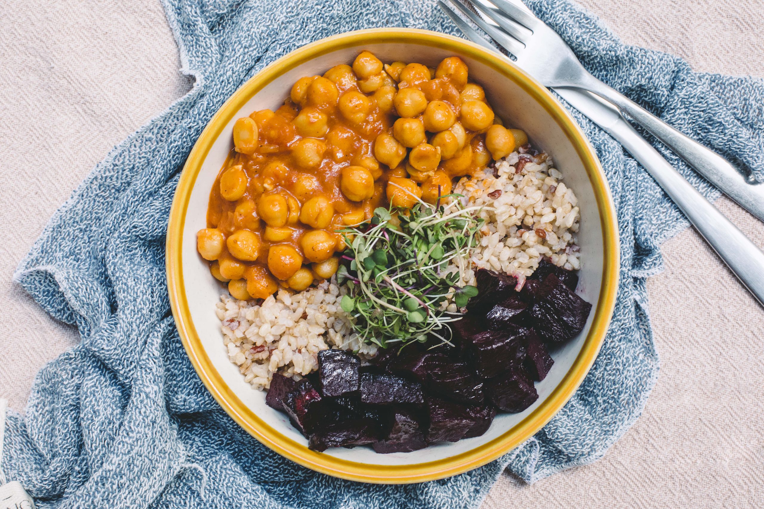 Curry de grão de bico com arroz cateto e vermelho e beterraba assada com aceto balsâmico