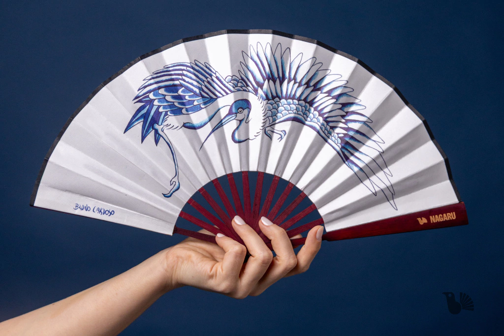 O leque Tsuru é uma verdadeira obra de arte, com design exclusivo do artista e tatuador Bruno Cardoso, que reinterpreta o clássico pássaro Tsuru, ave repleta de simbologia na cultura japonesa e clássica nas tatuagens orientais. Confeccionado em tecido duplo, é perfeito para enriquecer a decoração de ambientes autênticos e refinados. Acompanha suporte de madeira para ser colocado sobre uma mesa ou colado com fita banana na parede.