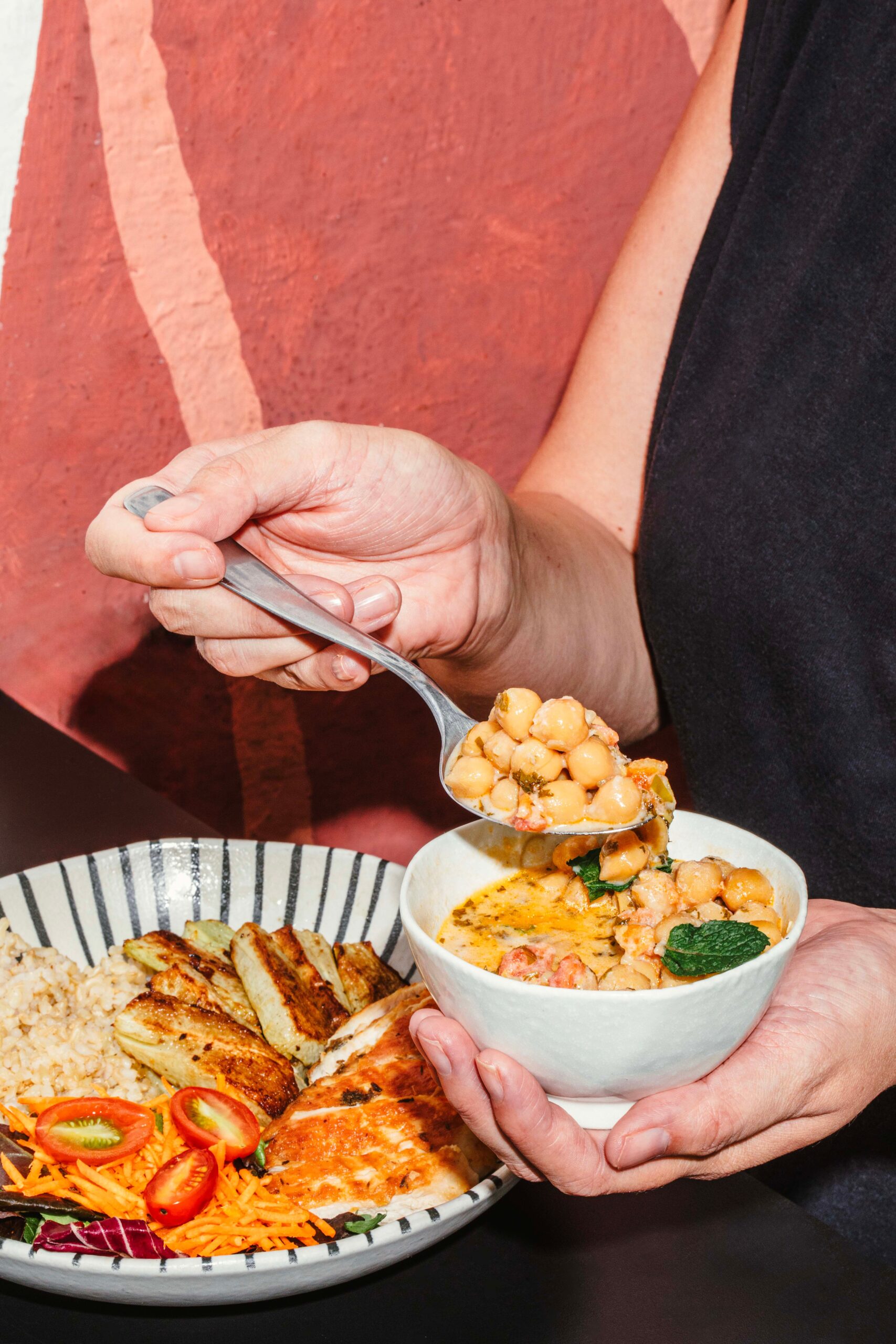 arroz integral, grão de bico com tahine, filet de frango Korin grelhado, chuchu assado com alho e cominho acompanha uma mini saladinha de folhas e tomatinho cereja