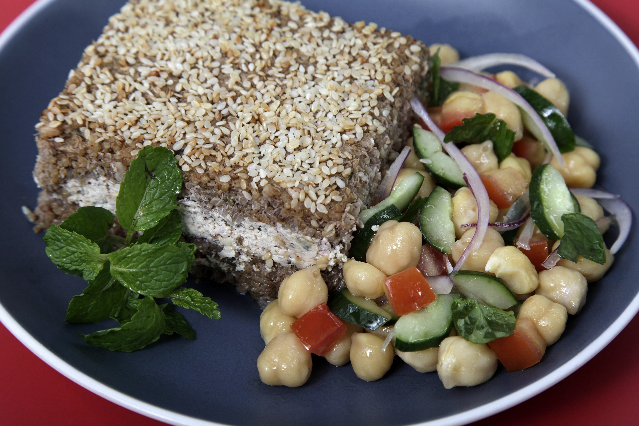 ingredientes: quinoa, berinjelas, cebola, alho, nozes, tahine, cebolinha picada, sal marinho, páprica defumada, gergelim branco, tofu, tofu defumado, hortelã, cebolinha, sal marinho, pimenta, bahara, zaatar, sumagre, limão, azeite