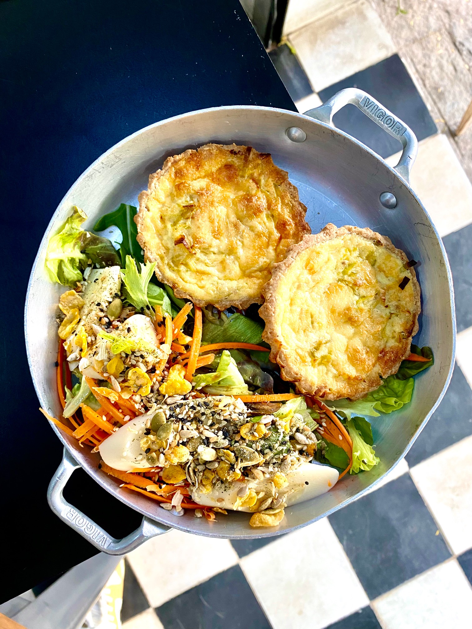 Mini quiche integral de alho poró com gruyère com mix de folhas, cenoura julienne, palmito e granola salgada