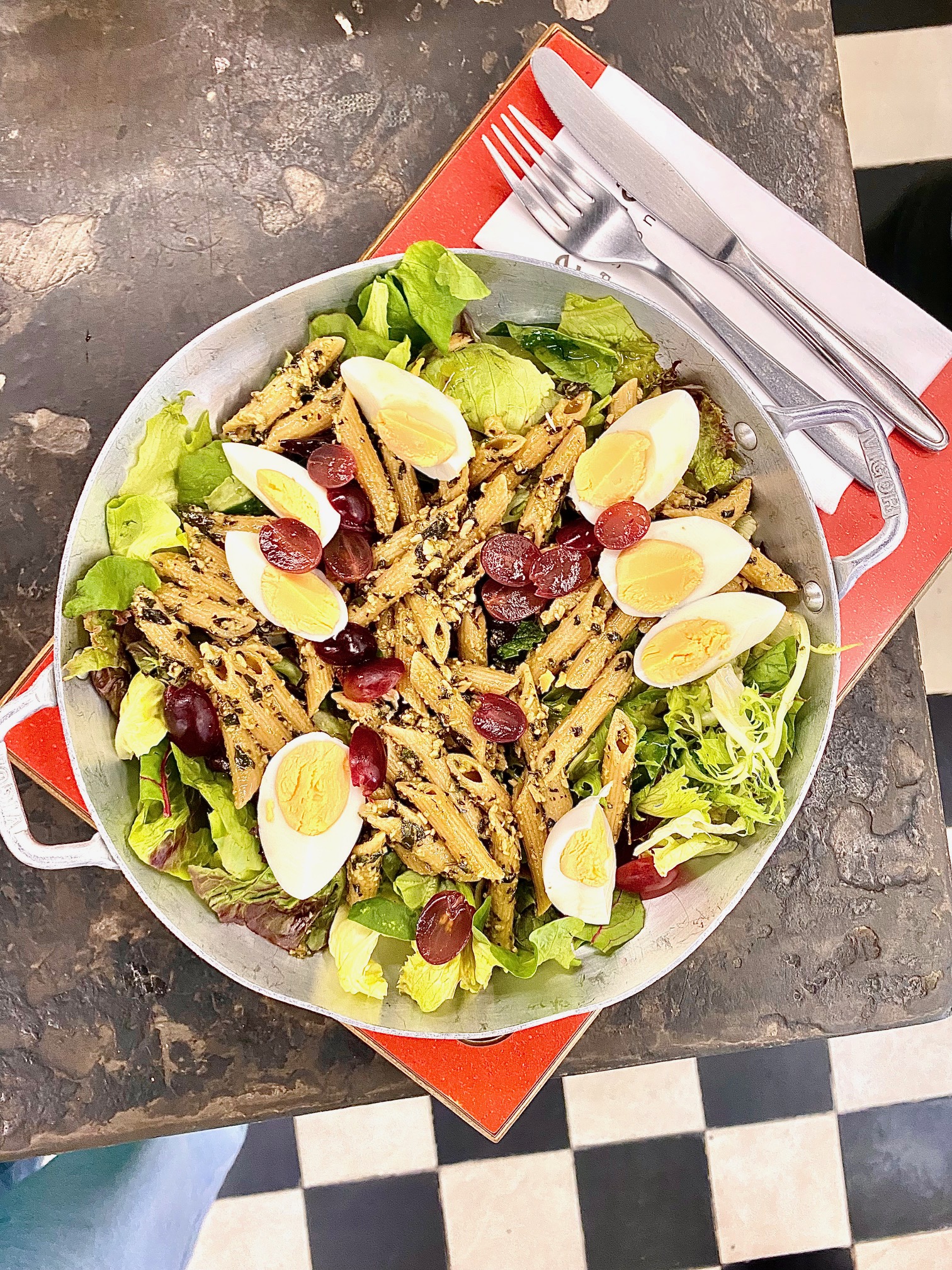 mix de folhas verdes, macarrão integral ao pesto, ovo cozido e uva vermelha marinada no vinagre de vinho tinto