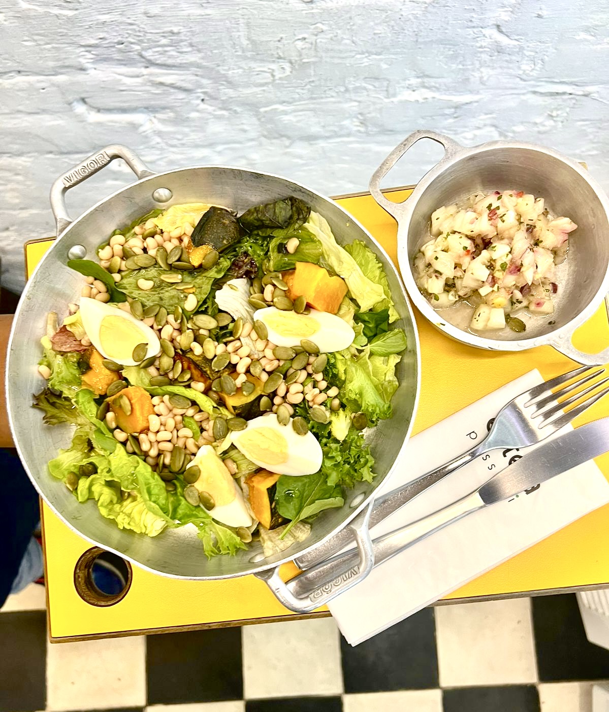 mix de folhas verdes orgânicas, ovo cozido, feijão manteiguinha, abóbora assada, vinagrete de abacaxi e semente de abóbora