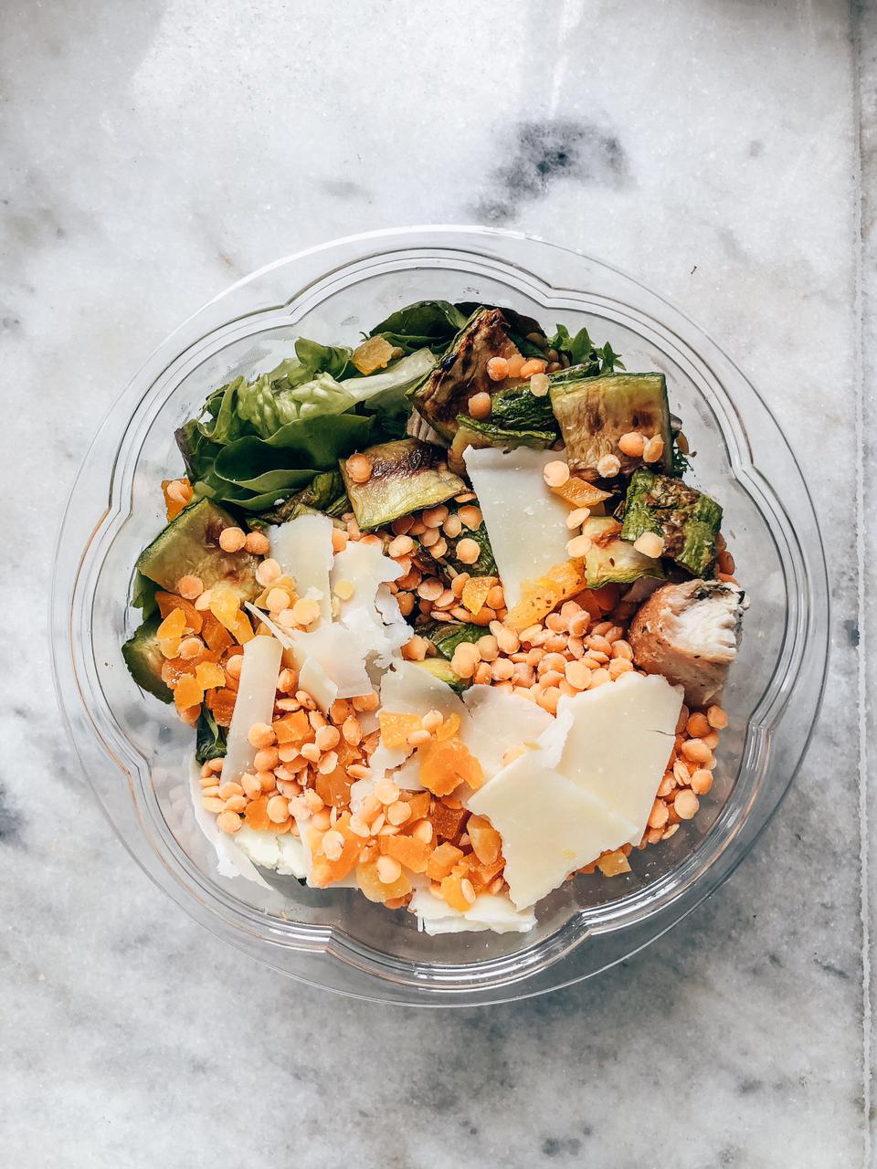 SALADONA de lentilha com frango: mix de folhas verdes, frango Korin grelhado em cubos, abobrinha grelhada, lentilha, damasco e lascas de parmesão com molho de vinho tinto