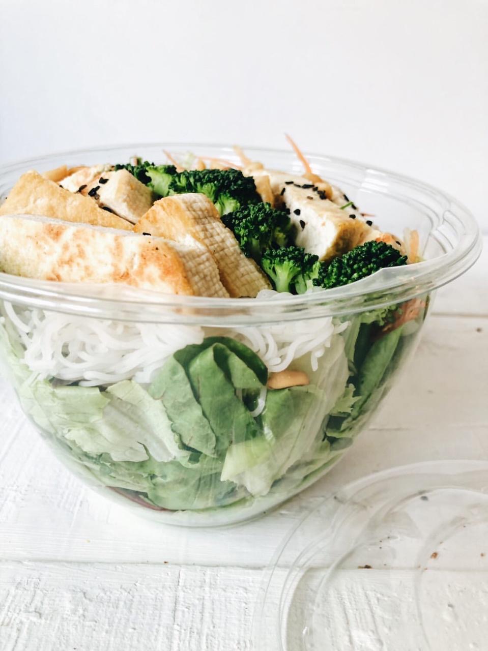 mix de folhas verdes, tofu orgânico grelhado, cenoura ralada, brócolis no vapor, bifum, cebolinha, gergelim preto e amendoim com molho de shoyu, azeite, óleo de gergelim, vinagre de arroz