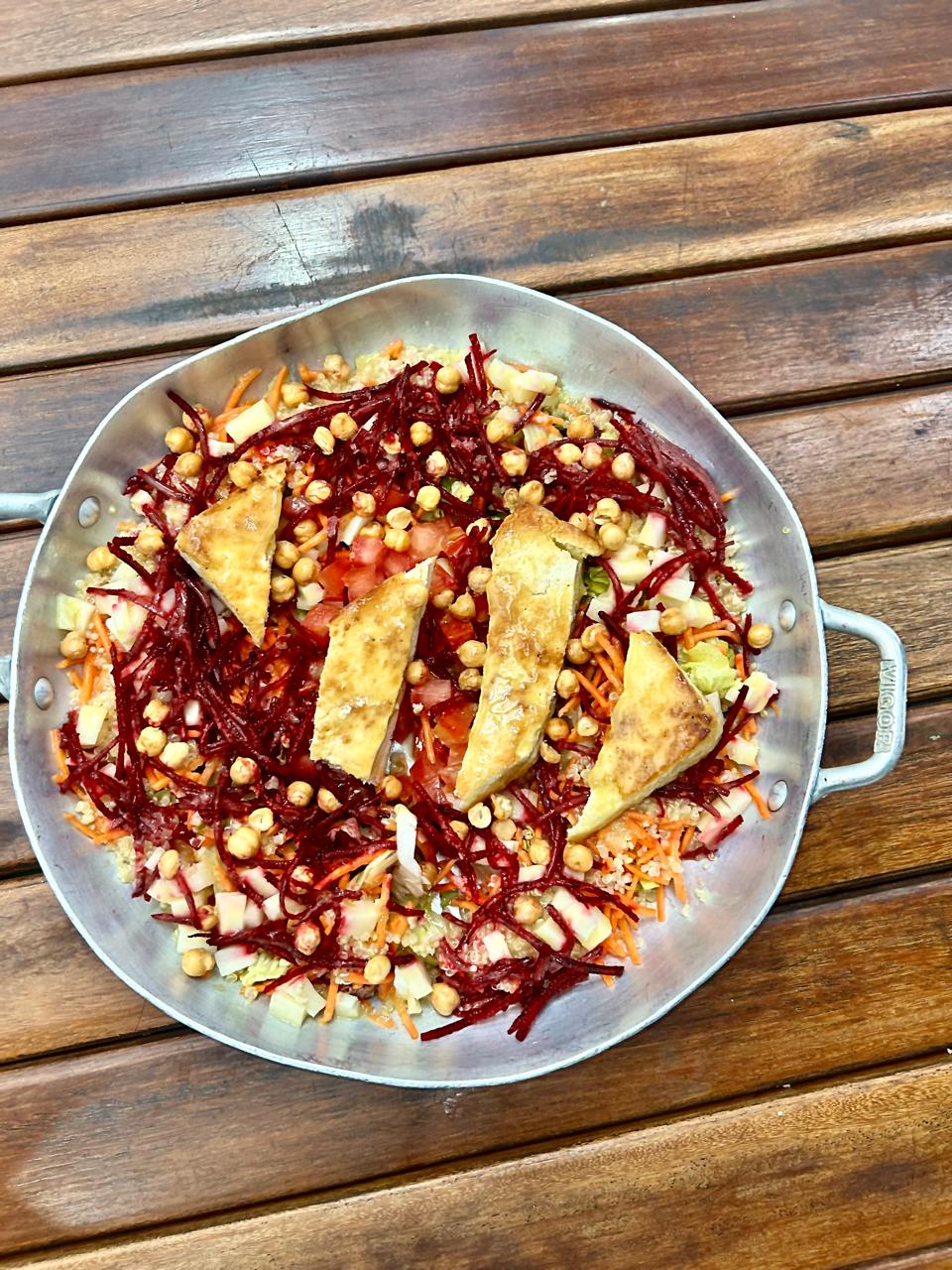 mix de folhas verdes orgânicas, com tofu orgânico grelhado com quinoa, cenoura e beterraba raladas, palmito, tomate em cubos e grão de bico torrado com molho: azeite, vinagre de maçã, mostarda, mel
