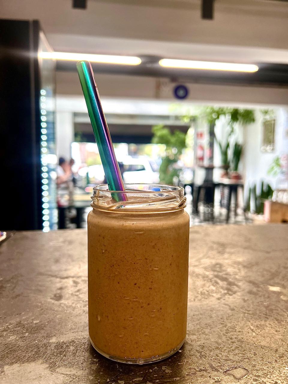 Smoothie Morango, Banana, Mel , Chia, Pasta de Amendoim e Leite de aveia NUDE
