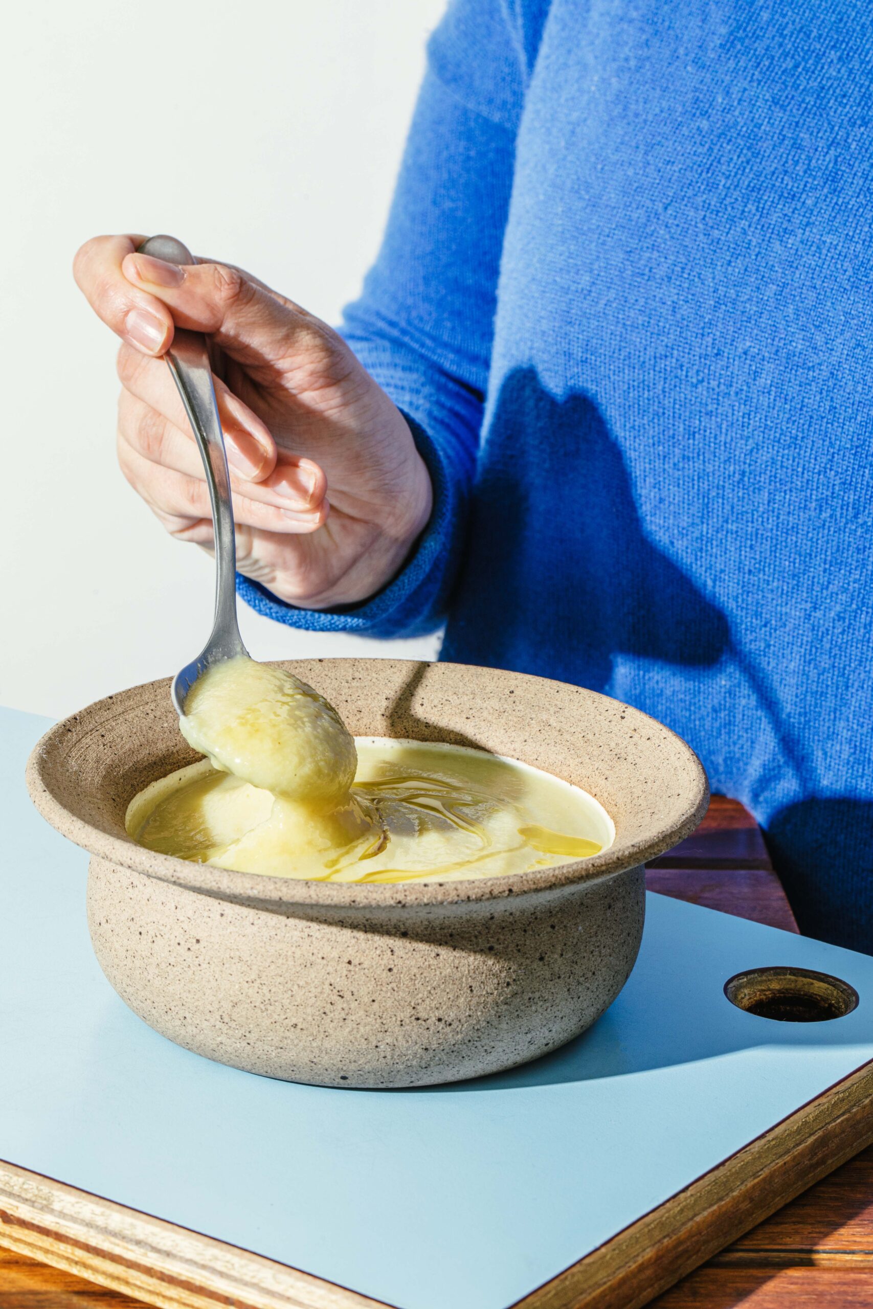 Sopa de couve flor com maçã, curry, açafrão servida com croutons integrais