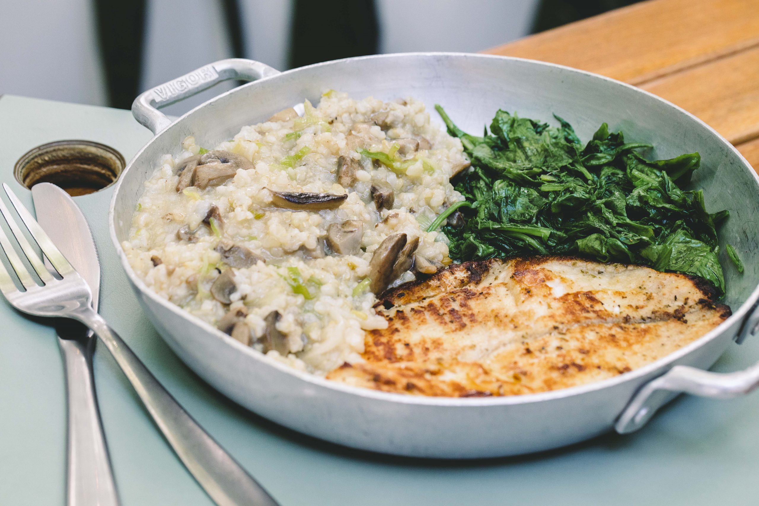 tilápia sem hormônio e orgânica grelhada com risoto de arroz integral com alho poró e cogumelos e mostarda salteada
